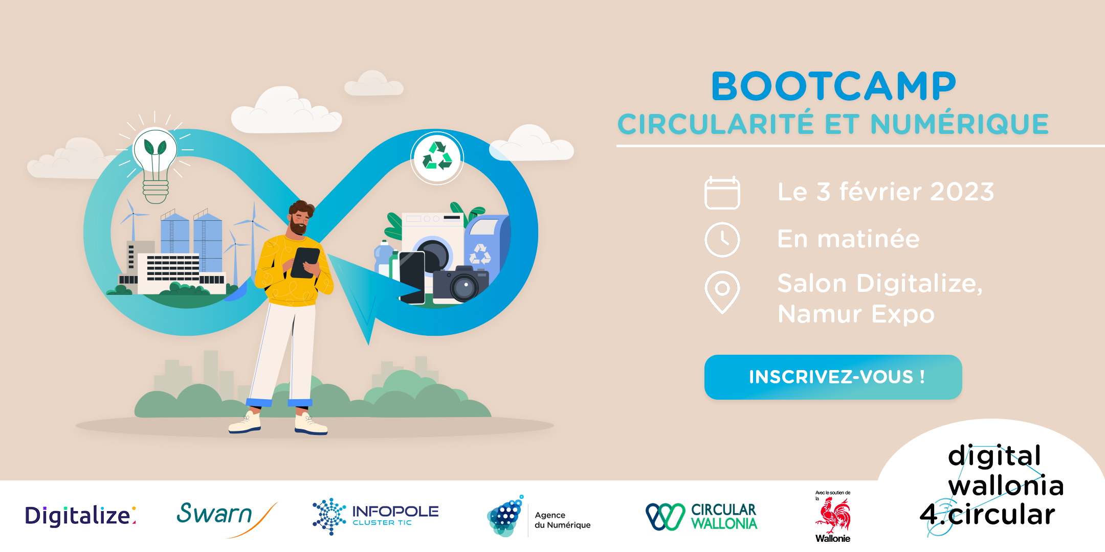 Thématique : "Comment optimiser l'utilisation des matières et énergies de mon entreprise? Le numérique comme accélérateur de l’économie circulaire : illustration avec la logistique inverse". Ce Bootcamp organisé par l'AdN et le SPW, animé par Swarn, dans le cadre du programme Digital 4 Circular Wallonia.